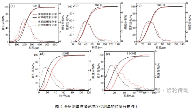 從各組的粒度累積分布曲線來(lái)看,對(duì)于較大磨粒(100、200、300 目)的測(cè)量,如圖 4(a ~ c)所示,兩種測(cè)量方法所得出的粒度累積分布曲線的形態(tài)相當(dāng)接近,表明全息系統(tǒng)的測(cè)量結(jié)果與激光粒度儀的測(cè)量結(jié)果一致性較高;而對(duì)較小磨粒(500、1 000 目)的測(cè)量,如圖 4(d、e)所示,激光粒度儀測(cè)得的粒徑分布結(jié)果顯示 0 ~ 20 μm 的磨粒占比超過(guò)了 50%,明顯大于全息測(cè)量方法的測(cè)量結(jié)果。
