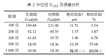 為了更好地比較兩種測(cè)量系統(tǒng)在粒徑測(cè)量結(jié)果上的差異,引入顆粒粒徑分析中典型的指標(biāo) Dv50 來(lái)進(jìn)行分析。Dv50 是指樣品的累計(jì)粒度分布百分?jǐn)?shù)達(dá)到 50%時(shí)所對(duì)應(yīng)的粒徑,也被稱為中位徑或中值粒徑,可以用來(lái)表示粉體的平均粒度。分別對(duì)實(shí)驗(yàn)組和對(duì)照組的數(shù)據(jù)計(jì)算中位徑 Dv50,結(jié)果見(jiàn)表 2。