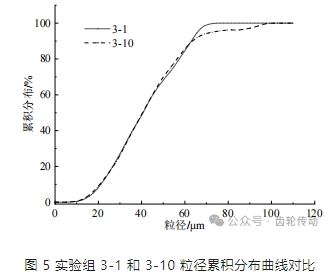 分別統(tǒng)計(jì)實(shí)驗(yàn)組 3-1 組和 3-10 組的磨粒粒徑分布情況,以體積分布繪制成粒度累積分布曲線,如圖 5 所示,兩者的粒度累積分布曲線形態(tài)接近。針對(duì)該兩組實(shí)驗(yàn)的數(shù)據(jù),分別計(jì)算其 Dv50,得到 3-1、3-10 實(shí)驗(yàn)組的 Dv50分別為 40.71、40.43 μm,兩者結(jié)果同樣相近。結(jié)果初步表明,全息測(cè)量系統(tǒng)在較低磨粒濃度下測(cè)得的磨粒粒徑結(jié)果與在較高磨粒濃度下測(cè)得的結(jié)果基本一致。
