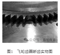 根據(jù)2. 8 L發(fā)動機的市場故障信息統(tǒng)計,近3年來,飛輪齒圈頻繁出現(xiàn)斷齒故障,如圖1所示。出現(xiàn)斷齒情況的發(fā)動機行駛里程均在1萬km以內(nèi),屬于早期失效。由圖1可見,飛輪摩擦面無異常磨損和燒蝕,其背面也無異常狀況;齒圈中有1個齒從根部斷裂,其相鄰的2個齒有輕微磨損,其余齒面無磨損。