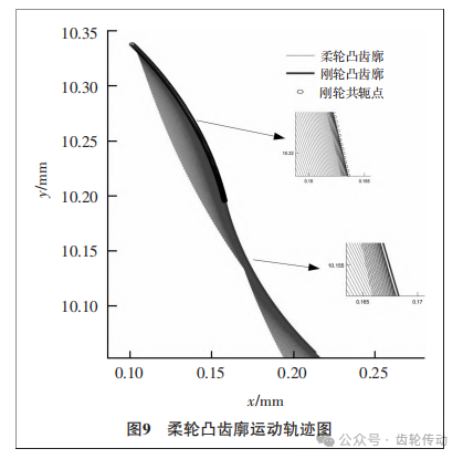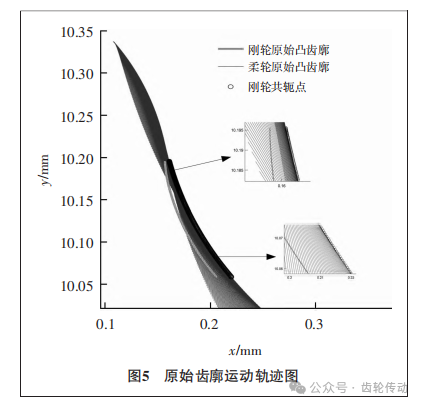 用上述的方法同樣可以求解剛輪凹齒廓,基于柔輪的運動軌跡,通過柔輪凸齒廓求解剛輪的共軛凹齒廓。