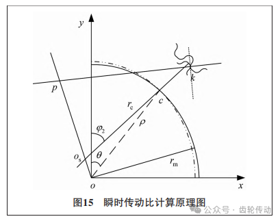 根據Willis定理,若兩齒廓的接觸點為k,則經過k點的公法線與瞬時回轉中心連接線oos的交點p就是瞬時嚙合節點。故嚙合節點的瞬時傳動比可以表示為