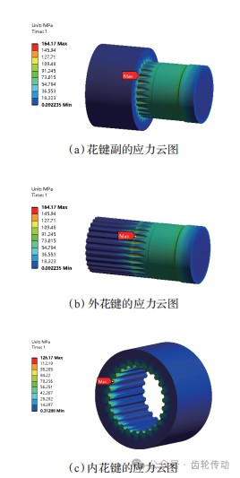 如上文所述,花鍵軸在完成結構設計后,由于解析法存在的種種假設,需要采用有限元法進行強度分析。由于花鍵副存在非線性接觸,需建立起花鍵副的實際模型進行分析,即在齒面上建立接觸對,以內花鍵作為目標面,外花鍵作為接觸面;摩擦系數設置為0.1;對內花鍵外端面全約束,對外花鍵的約束為徑向和軸向自由度,保留切向自由度;在端面上施加的扭矩載荷為2000N·m?;ㄦI副的應力云圖如圖2所示。其中,外花鍵最大應力為164MPa,發生在外花鍵靠近輸入端的齒根位置。內花鍵的最大應力為126MPa,發生在內花鍵的齒頂位置處。相比內花鍵,外花鍵受載更大,因此內、外花鍵中,僅校核外花鍵一處即可。