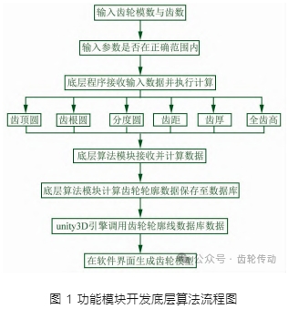 基于 Python、C#等計(jì)算機(jī)語言編程技術(shù),通過調(diào)用編譯的齒輪參數(shù)運(yùn)算底層算法模塊代碼庫及數(shù)據(jù)庫,以 unity3D 引擎二次開發(fā)為手段,實(shí)現(xiàn)自動(dòng)運(yùn)算并實(shí)時(shí)生成對(duì)應(yīng)齒輪系統(tǒng) 3D 數(shù)字模型的交互式、可視化實(shí)時(shí)場(chǎng)景呈現(xiàn)功能,并通過仿真運(yùn)行對(duì)齒輪傳動(dòng)設(shè)計(jì)的正確性進(jìn)行功能驗(yàn)證。以齒輪分析與設(shè)計(jì)模塊為例,設(shè)計(jì)并制定該功能模塊的算法開發(fā)流程,如圖 1 所示。輸入齒輪模數(shù)與齒數(shù)后,系統(tǒng)會(huì)自動(dòng)調(diào)用底層算法進(jìn)行比較分析,將符合條件的參數(shù)設(shè)計(jì)值的計(jì)算結(jié)果返回系統(tǒng)界面,自動(dòng)繪制相應(yīng)參數(shù)下的齒輪輪廓線并生成三維模型,實(shí)現(xiàn)從數(shù)學(xué)模型到三維可視化模型的轉(zhuǎn)化。