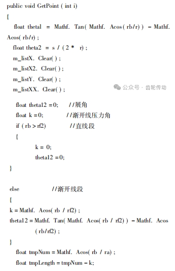 多功能試驗(yàn)系統(tǒng)底層算法數(shù)學(xué)建模:通過數(shù)學(xué)建模工具 AlgDesigner V3.0 的二次開發(fā),將齒輪幾何參數(shù)、基本尺寸計(jì)算及輪廓線生成編譯轉(zhuǎn)化為底層運(yùn)算代碼,為程序調(diào)用提供底層數(shù)據(jù)支撐,實(shí)現(xiàn)齒輪機(jī)構(gòu)尺寸自動(dòng)化計(jì)算功能。以下是編寫的部分齒輪輪廓線自動(dòng)生成的底層算法數(shù)學(xué)建模代碼段。