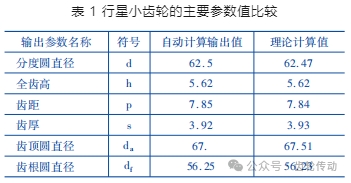 行星小齒輪工程應(yīng)用設(shè)計(jì):已知行星小齒輪的設(shè)計(jì)模數(shù) m = 2.5,齒數(shù) z = 25,分別使用試驗(yàn)系統(tǒng)和人工計(jì)算,對(duì)其系統(tǒng)自動(dòng)計(jì)算輸出值與理論計(jì)算值進(jìn)行對(duì)比分析,結(jié)果如表 1 所示,在誤差允許范圍內(nèi),系統(tǒng)輸出值與理論值高度一致。