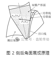 (1) 左側(cè)后角面入口第 1 個齒根處的 E 點,此點是展成齒頂?shù)膫?cè)刃帶 P1 點時產(chǎn)生的,如圖 13 所示。
