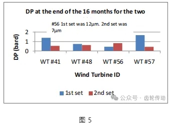 第二套濾芯仍然安裝在這四臺風機上。新濾芯有三支 12µm(Pall“S”級濾材)安裝在三臺風機上,一支 7µm(Pall“N”級濾材)安裝 #56 風機上,粗過濾仍然是 25µm 的金屬網(wǎng)過濾器。同第一套一樣,定期取樣檢測齒輪箱油的清潔度和濾芯的壓差,直到 21 個月四支濾芯壓差都沒有到達 3 bard 報警值(注#48 風機第 19 個月因為齒輪箱維修,無法得到壓差值)。但整體壓差變化趨勢看,從 19 個月開始壓差開始加速增長,指示著濾芯快速堵塞,濾芯壽命即將結(jié)束(圖 6)。建議風場開始更換新的濾芯。