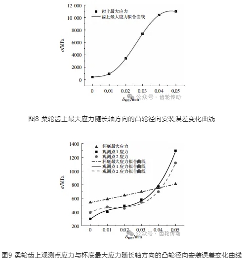 圖8為柔輪齒上最大應力隨長軸方向凸輪徑向安裝誤差變化曲線,圖9 為柔輪齒上觀測點應力和杯底最大應力隨長軸方向凸輪徑向安裝誤差變化曲線。