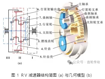 RV 減速器的結(jié)構(gòu)簡圖與幾何模型如圖 1 所示。目前國內(nèi)外 RV 減速器的研究主要集中于傳動(dòng)誤差、回差、扭轉(zhuǎn)剛度、振動(dòng)特性、磨損壽命和加工工藝 6 個(gè)方面。