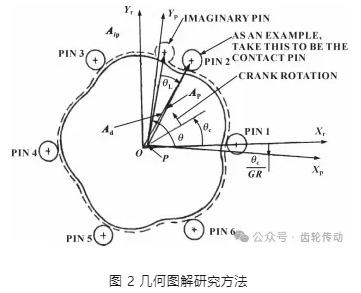 早期關(guān)于傳動(dòng)誤差的研究主要是通過幾何法研究靜態(tài)傳動(dòng)誤差。如圖 2 所示,BLANCHE 等使用幾何法計(jì)算了擺線齒輪單級(jí)傳動(dòng)誤差,求解了齒廓加工誤差和機(jī)構(gòu)裝配誤差所引起的齒側(cè)間隙計(jì)算公式,初步分析了單級(jí)擺線齒輪減速器的傳動(dòng)誤差。隨后基于幾何法,又有學(xué)者進(jìn)一步將擺線針輪減速器整體作為研究對象,研究了擺線齒輪減速器傳動(dòng)誤差與齒形的關(guān)系。何衛(wèi)東、REN 等將傳動(dòng)誤差和承載能力作為優(yōu)化目標(biāo)函數(shù),提出了擺線輪修形量優(yōu)化設(shè)計(jì)模型,并通過實(shí)驗(yàn)驗(yàn)證了該方案的可行性,為擺線齒輪修形方式和修形量的選取提供了指導(dǎo)。在此基礎(chǔ)上,LIN 等定量分析了各種擺線齒輪不同修形組合對傳動(dòng)誤差的影響。以上研究反映了靜態(tài)傳動(dòng)誤差與齒形的關(guān)系。