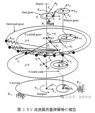 除了齒形誤差以外,在更為復(fù)雜的 RV 減速器中,裝配和制造誤差的組合形式是多種多樣的,對此日本學(xué)者日高照晃等的研究建立了如圖 3 所示 RV 減速器等價(jià)數(shù)學(xué)模型,將各零件視為剛體并用等價(jià)彈簧連接,研究了減速器的靜態(tài)傳動(dòng)誤差,先后探究了單項(xiàng)加工、裝配誤差對傳動(dòng)誤差的影響和多種誤差綜合作用對傳動(dòng)誤差的影響,為其后 RV 減速器傳動(dòng)特性研究提供了重要的理論基礎(chǔ)。上述學(xué)者在幾何、靜態(tài)層面深入探究了制造、裝配誤差及輪齒修形與減速器靜態(tài)傳動(dòng)誤差的關(guān)系。