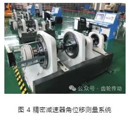 傳動(dòng)精度檢測技術(shù)研究方面,路遙環(huán)等使用光電自準(zhǔn)直儀和 24 面棱體結(jié)合的方法,優(yōu)化現(xiàn)有光學(xué)測試裝置結(jié)構(gòu),實(shí)現(xiàn)了對微小角位移的精確測量,初步滿足了減速器角位移測量的精度要求。隨后出現(xiàn)了量產(chǎn)商用的成熟 RV 傳動(dòng)精度檢測平臺(tái),如圖 4 所示,彭昌琰研制了成熟的空載和負(fù)載兩種工況下的整體式精密減速器傳動(dòng)誤差測試系統(tǒng),完成了傳動(dòng)誤差測試系統(tǒng)樣機(jī)研制,開展了測試重復(fù)性、抗振動(dòng)沖擊干擾的性能測試試驗(yàn),確保測試系統(tǒng)具有良好的穩(wěn)定性。