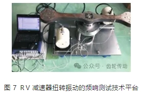 機(jī)制研究方面,YU 和 HE 等通過模態(tài)分析和理論計(jì)算,研究了 RV 減速機(jī)主要部件的固有特性,得到它們的固有頻率、振型和嚙合頻率。YANG 等通過 RV 減速器集中參數(shù)模型,研究了包括剛度、質(zhì)量、轉(zhuǎn)動(dòng)慣量和曲軸偏心在內(nèi)的參數(shù)對 3 種振動(dòng)模式固有頻率的影響,并分析了輸出振動(dòng)對偏心距的靈敏度。杜雪松等為開展變齒厚 RV 減速器動(dòng)態(tài)特性研究,建立了考慮輪齒的時(shí)變嚙合剛度、軸承剛度和傳遞誤差等因素的減速器動(dòng)力學(xué)模型,研究了上述參數(shù)變化對動(dòng)態(tài)嚙合力及傳動(dòng)誤差的影響規(guī)律。檢測技術(shù)方面,譚晶等人采用白噪聲和掃頻激勵(lì)法的原理,搭建了如圖 7 所示 RV 減速器扭轉(zhuǎn)振動(dòng)測試裝置,研究了 RV 減速器扭振的頻響測試技術(shù)。