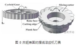 除使用磨削加工擺線齒輪齒形以外,學(xué)者們還摸索了其他擺線齒輪加工方法。針對單件小批量試制生產(chǎn)測試的場合,成型齒輪磨床的加工柔性無法適應(yīng)齒形變化復(fù)雜的擺線齒輪加工要求; 相比之下,慢走絲線切割加工具有加工柔性強(qiáng)、加工效率高、加工精度高等優(yōu)勢。因此郭霜等人針對慢走絲線切割工藝加工擺線齒輪進(jìn)行了可行性分析驗(yàn)證,發(fā)現(xiàn)該加工方法能適應(yīng)不同齒廓修形方案,在研發(fā)階段和小批量試制階段非常適用。WANG 等提出一種如圖 8 所示基于共軛表面原理的擺線滾齒機(jī)刀具設(shè)計(jì)方法,通過設(shè)計(jì)實(shí)例、機(jī)加工仿真和機(jī)加工試驗(yàn)驗(yàn)證了該設(shè)計(jì)方法的可行性。