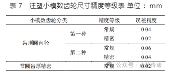 小模數齒輪注塑成形加工工藝受材料和工藝方法的影響,所能達到的尺寸精度存在差異,如表 7 所示。例如,齒頂圓直徑存在兩種精密度等級,分別為 0.02 mm 和 0.04 mm。兩種等級對應的常規尺寸也不相同,分別為 0.04 mm 和 0.06 mm。