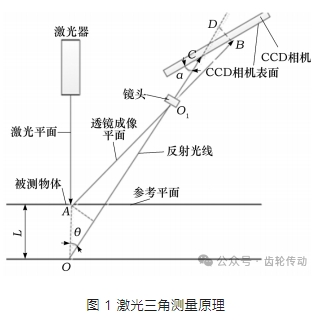 圖 1 中: 點 A 為被測物體在參考平面的基準點; 點 L 為被測物體偏離參考平面基準點的距離; 點 O 為點 A 偏離參考平面基準點所在的點; 點 O1 為反射光線與透鏡成像平面在鏡頭處的交點; 點 B 為透鏡成像平面與 CCD 相機表面的交點; 點 C 為反射光線與 CCD 相機表面的交點; 點 D 為點 O1 經反射后在 CCD相機處的聚焦點; α 為反射光線與 CCD 相機表面之間的夾角; θ 為激光平面與反射光線之間的夾角。
