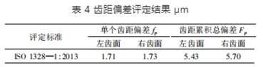將被測齒輪的齒距偏差評定結果與偏差許用值進行對比可知,該齒輪的左、右齒面的單個齒距偏差分別為 1.71 μm 和 1.73 μm( 見表 4) ,均小于該齒輪的單個齒距偏差許用值 2.22 μm,所以該齒輪的單個齒距偏差達到 2 級精度; 該齒輪的左、右齒面的齒距累積總偏差分別為 5.43 μm 和 5.70 μm(見表 4) ,均小于該齒輪的齒距累積總偏差許用值 6.89 μm,所以該齒輪的齒距累積總偏差達到 2 級精度。