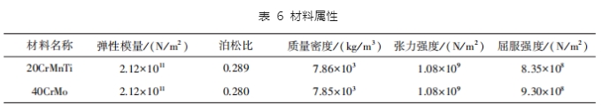 經(jīng)過對減速器中齒輪的失效形式分析并最終選定,太陽輪 a 和行星輪 c 使用材料為 20CrMnTi, 進(jìn)行滲碳淬火熱處理, 內(nèi)齒輪 b 使用材料為 40CrMo,進(jìn)行調(diào)質(zhì)熱處理。上述兩種材料屬性如表 6 所示。