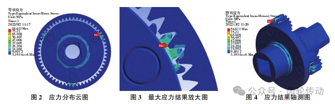 應(yīng)力分布云圖、最大應(yīng)力結(jié)果放大圖和應(yīng)力結(jié)果軸測圖分別如圖 2、圖 3 和圖 4 所示。從圖 2 可以看出行星齒輪輪齒和輸出軸根部應(yīng)力較大并且最大應(yīng)力在行星齒輪根部,為84.611 MPa,小于行星輪許用齒根彎曲應(yīng)力值 529 MPa,故行星輪齒根彎曲強(qiáng)度校核通過。從圖 4可以發(fā)現(xiàn)行星齒輪輪齒應(yīng)力沿齒向分布不均勻程度較大,這主要是由于行星架結(jié)構(gòu)采用的是單側(cè)板式行星架結(jié)構(gòu)。所以如果所設(shè)計微型行星齒輪減速器空間條件允許的情況下,可以考慮使用雙側(cè)板整體式行星架。