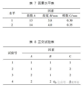 選取行星輪齒數(shù)、模數(shù)和齒寬 3 個參數(shù)作為正交試驗(yàn)因素,每個影響因素取兩個水平,設(shè)計 L4(23)正交表,三因素水平表如表 7 所示,正交試驗(yàn)表如表 8 所示。