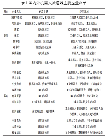 表 1 為國內外精密減速器主要企業名單,列舉了其主要產品類型和應用領域。從表中可以看出,減速器企業按照減速器剛性和柔性之分,一部分企業專注于諧波減速器生產,另一部分聚焦在 RV 減速器研發,較少有企業兼顧兩者的研發,由于其結構差別比較大、制造工藝質量水平不同有關。從應用領域分析,國外企業減速器主要在工業機器人領域得到廣泛應用,在工業領域技術沉淀時間長,國內減速器企業深入在服務、機床、物流等多領域應用也不斷增加市場份額,同時國內企業通過定制化解決方案逐漸提高了工業領域減速器應用的占比,減少了與日本哈默納科、納博等外資巨頭的差距。此外,目前國內減速器企業也逐漸轉型獨自研發工業機器人,如中大力德、同川科技、大族等,反映出企業技術創新自主研發能力的提升,更好實現精密減速器應用發展。