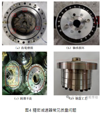 根據最新的《機器人用精密減速器關鍵性能評測報告》顯示,國產精密減速器普遍在傳動誤差、精度保持性、耐久性與壽命與國外先進產品相比仍存在差距。特別在材料與制造工藝、產品質量一致性所涉及的關鍵技術還不成熟,尚未滿足國內高端應用市場需求。如圖 4 所示,國產精密減速器在實際使用中,容易出現齒輪磨損、軸承損壞、制造工藝等方面的質量問題,嚴重影響產品可靠性和使用壽命。