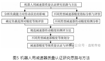通過對現有精密減速器的檢測標準和認證分析可知,目前國家標準對減速器性能測量沒有對負載能力提出明確的界定,針對不同類型減速器如空程、回差,精度等級劃分沒有形成統一的標準與規范。此外,目前機器人用減速器均采用產品類認證,且認證要求高,范圍覆蓋減速器精度、剛度和效率等項目,卻無法評估某指標所處的質量水平,因此提出以下建議:(1)依據國家標準,規范精度等級認證的精密減速器測量技術研究;(2)在認證模式方面,采用產品檢測、工廠檢查以及質量監督相結合的模式;(3)在產品范圍方面,應覆蓋諧波、RV、行星、擺線針輪多種類型減速器,應該統一檢測項目與指標,規范不同產品的精度等級分級模式,圖 5 所示為研究思路與方法。