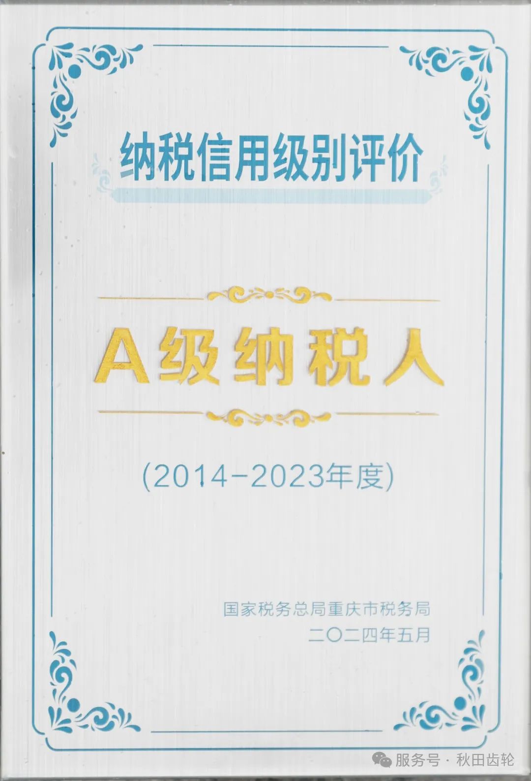 據(jù)悉,國家稅務(wù)總局重慶市稅務(wù)局公布納稅信用級別評價結(jié)果,重慶秋田齒輪有限責(zé)任公司連續(xù)10年獲得A級納稅人企業(yè)并獲得授牌。