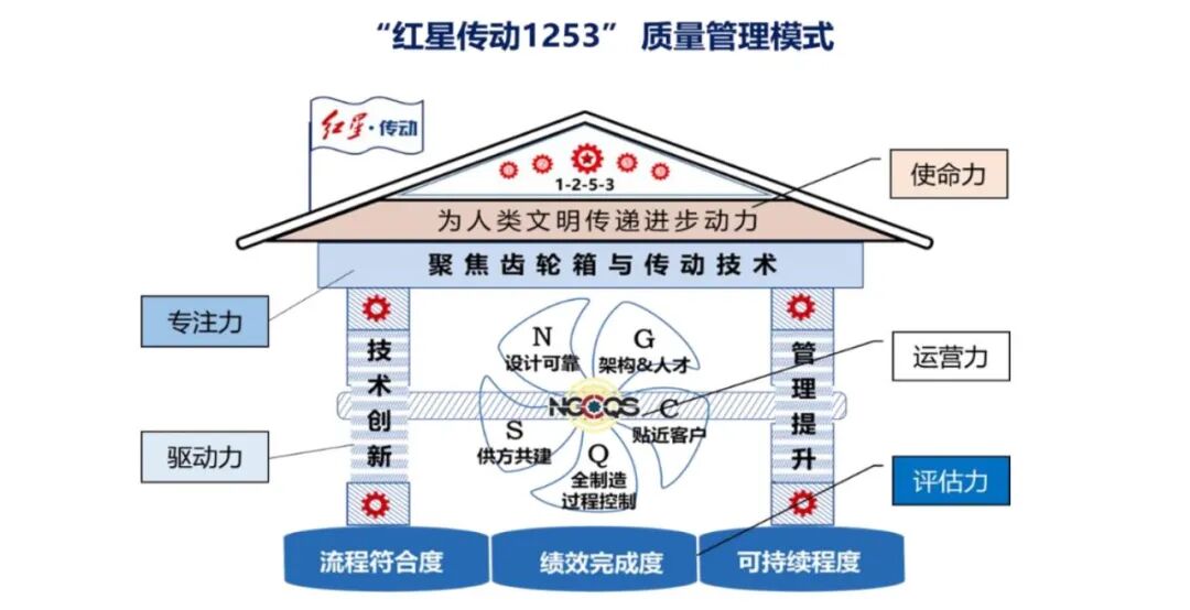 南高齒此次能斬獲榮譽,核心在于其獨創的 “紅星傳動 1253” 質量管理模式 —— 這也是大會關注的焦點亮點。該模式以企業戰略定位為指引,構建 “技術創新 + 管理提升” 雙輪驅動體系,搭建起以客戶為中心的 NGCQS 大質量管理運營平臺,最終形成覆蓋產品全生命周期的閉環質量管控體系。